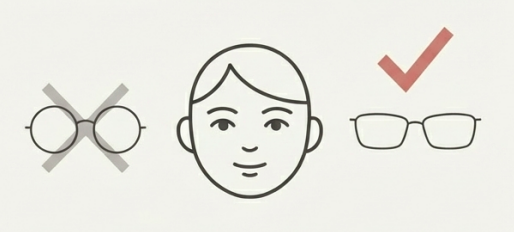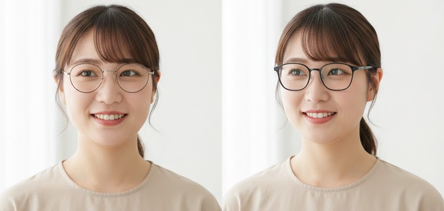 逆に、丸みのあるボストン型やオーバル型を選んでしまうと、顔の丸さとフレームの曲線が同調してしまい、より幼く見えたり、顔が膨張して見えたりする可能性があるので注意が必要です。「細身×スクエア」の方程式さえ守れば、丸顔さんでも十分に楽しめますよ。