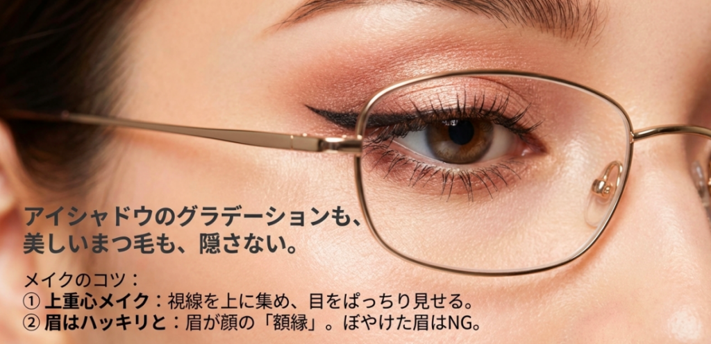 フレームが下にある分、どうしても顔の重心が下がりがちになります。そのため、メイクでは「上」を意識することが重要です。アイシャドウは明るい色をベースに、締め色(濃いブラウンなど)を少し広めに入れ、目元の印象を引き締めましょう。