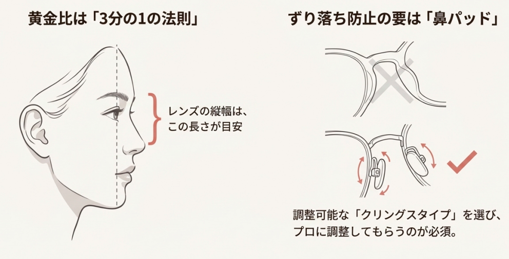 - レンズの縦幅: 眉から顎までの長さの「3分の1」を目安にする。