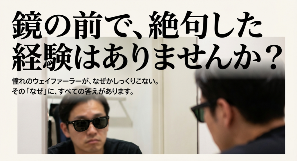 頬にフレームが食い込む、笑うとサングラスが持ち上がる、なんだか眉毛が浮いて見えてしまって決まらない。インターネットで検索窓に「ウェイファーラー」と打ち込むと、サジェストに「日本人 似合わない」という残酷なキーワードが出てきて、さらに落ち込んでしまった方もいるかもしれません。