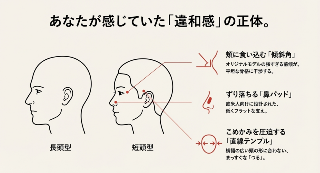 オリジナルモデルのテンプル(つる)は、長頭型に合わせて直線的な形状をしています。これを横幅の広い日本人の頭にはめようとすると、テンプルが外側に無理やり押し広げられる「逆ハの字」状態になります。