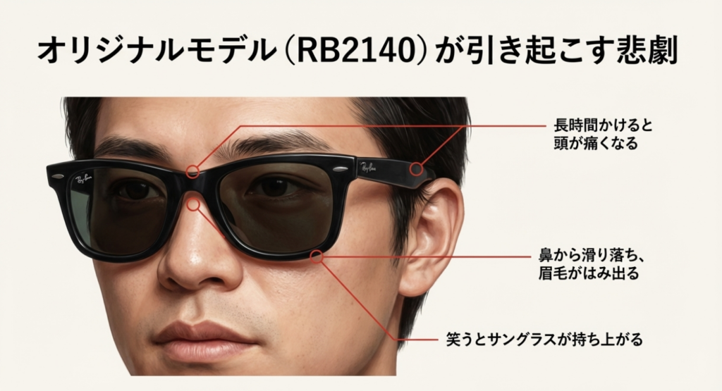 フレームの下部が頬の肉に深く突き刺さります。これは単に痛いだけでなく、笑ったり会話をしたりして頬が動くたびに、サングラス全体が「グイッ」と持ち上げられてしまうのです。