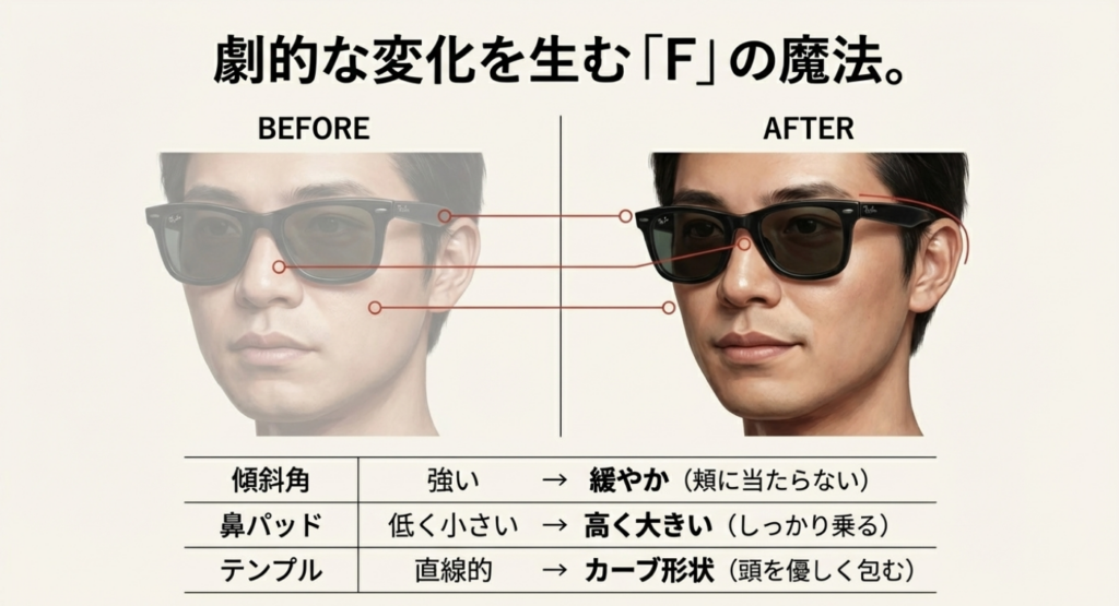 公式サイトでも「Low Bridge Fit(低い鼻のブリッジにフィットする)」として紹介されており、頬骨への干渉やズレ落ちといったストレスが劇的に解消されています。見た目の「ウェイファーラーらしさ」を損なわずに、掛け心地だけが快適になっている、まさに日本人のための救世主と言えるでしょう。