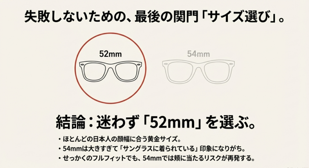 明らかに顔の幅が広い自覚がある方や、あえてオーバーサイズでルーズに掛けたい方以外は、52mmを選んでおけば間違いありません。