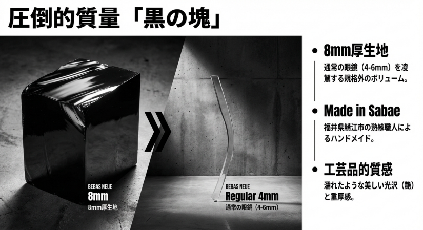 一般的なプラスチックフレームの厚みが4mmから6mm程度であるのに対し、エフェクターの多くのモデルは「8mm厚」のアセテート生地を贅沢に使用しています。