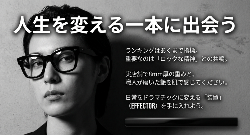 ぜひ実店舗に足を運び、その8mm厚アセテートの重みと、職人が磨き上げた美しい艶を肌で感じてみてください。その一本が、あなたの日常をドラマチックに変える「エフェクター(装置)」になることを願っています!