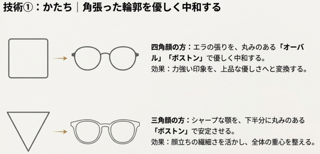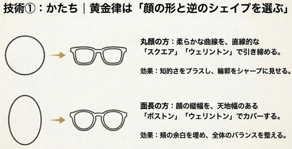 - 顔の形(丸顔・面長など)に合わせたフレーム選びの基本ルール