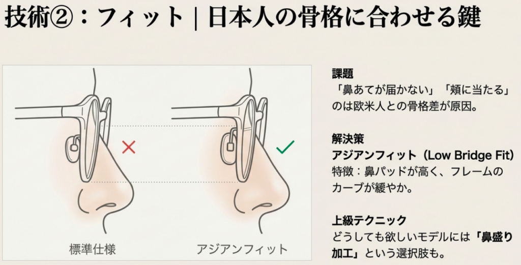 - 日本人が快適にかけるための「アジアンフィット」と鼻盛りの重要性