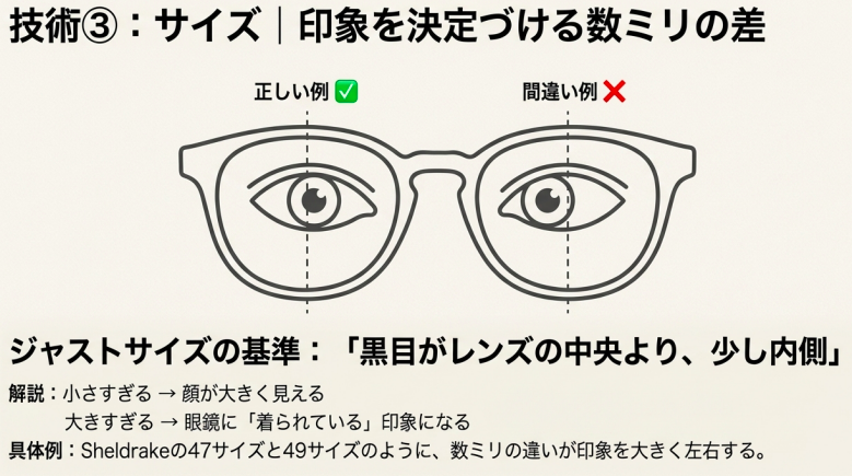 目がレンズの外側に寄りすぎている(離れ目に見える)と、メガネが小さすぎて顔が大きく見えてしまいます。逆に、目が内側に寄りすぎている(寄り目に見える)と、メガネに着られているような印象になりがちです。