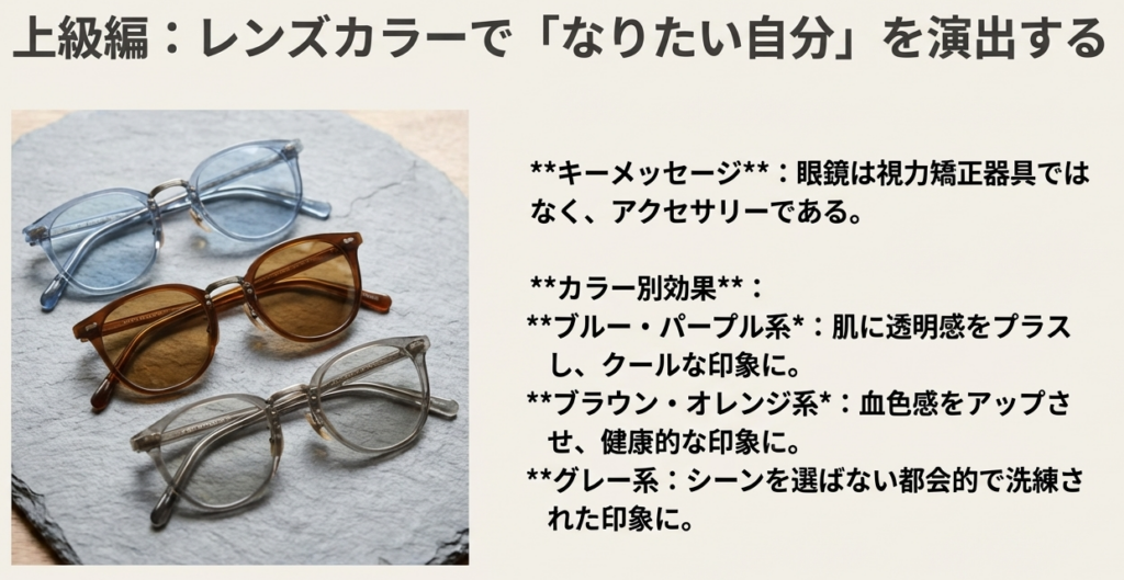 フレームだけでなく、レンズカラーも「似合う顔」を作る重要な要素です。最近は、目が透けて見える程度のライトカラーレンズ(濃度15%〜35%)を入れるのが主流です。