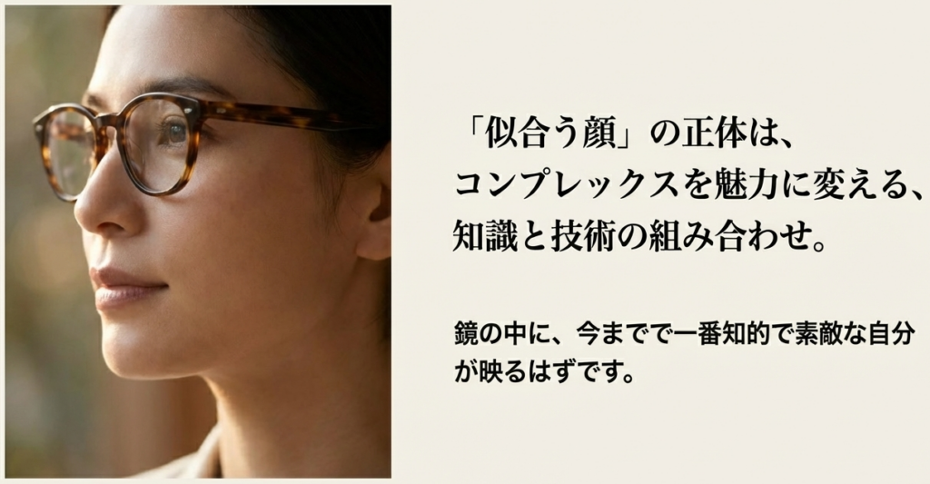 メガネ選びの黄金律をご存知でしょうか。それは「顔の形と逆のシェイプを選ぶ」ということです。これにより、顔のコンプレックスを中和し、バランスの取れた「似合う顔」を作ることができます。