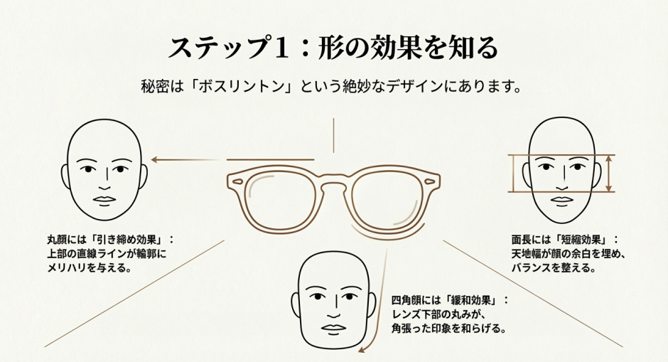 これは、丸みを帯びた逆三角形の「ボストン」と、台形に近い四角形の「ウェリントン」の要素を、絶妙なバランスで融合させたスタイルです。このハイブリッドな形状こそが、日本人に多い「丸顔」や「面長」のコンプレックスを解消する鍵となります。