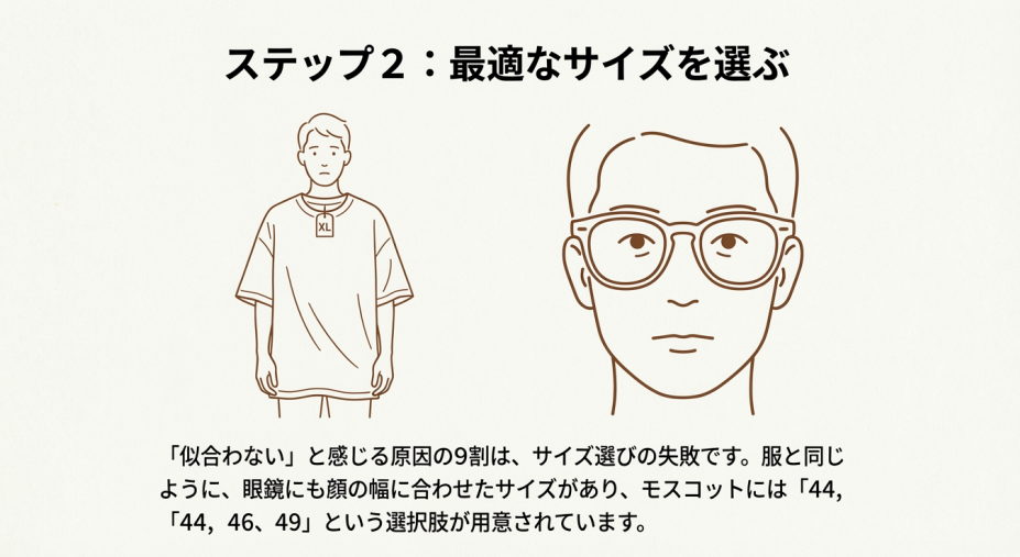 多くの眼鏡ブランドが「ワンサイズ展開」であるのに対し、モスコットは伝統的に「44・46・49・52」という細かいサイズ展開を行っています(※52はサングラス展開が主)。