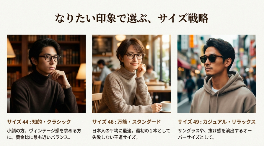 サイズ選びに正解は一つではありません。「知的で真面目に見せたいなら44」「カジュアルに普段使いしたいなら46」というように、なりたい自分に合わせてサイズを使い分けるのが上級者のテクニックです。