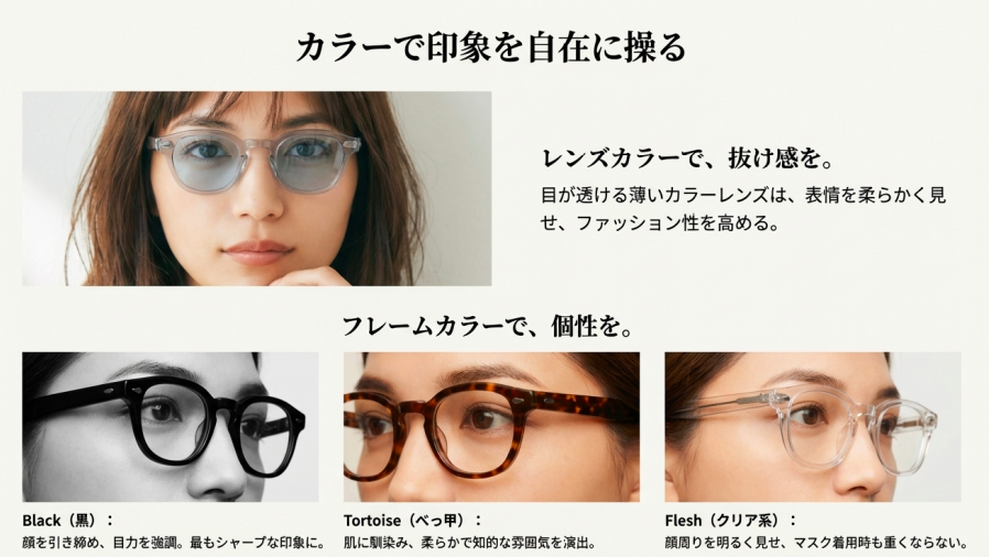 最後に、フレームの「カラー」が顔に与える影響についてお話しします。レムトッシュは20色以上の豊富なカラーバリエーションがありますが、選ぶ色によって顔の印象は劇的に変わります。