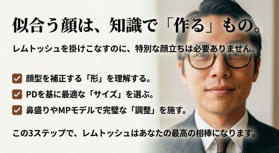 ここまで、骨格理論、サイズ選び、そしてフィッティング技術について詳しく解説してきました。結論として申し上げたいのは、「モスコットのレムトッシュが似合う顔」というのは、生まれつきの才能ではなく、正しい知識と調整によって作れるものだということです。