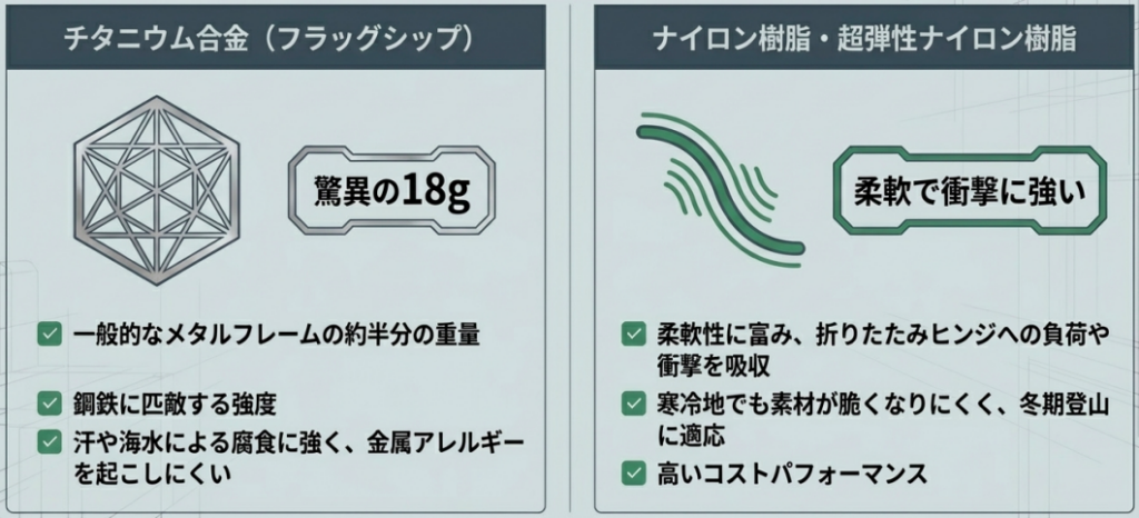 大きく分けると「チタニウム合金」と「ナイロン樹脂・超弾性ナイロン樹脂」の2系統があり、それぞれに明確な特徴とメリット・デメリットがあります。