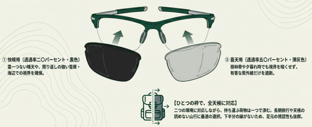サングラスを2本持っていく必要がなくなるので、パッキングがぐっとシンプルになります。