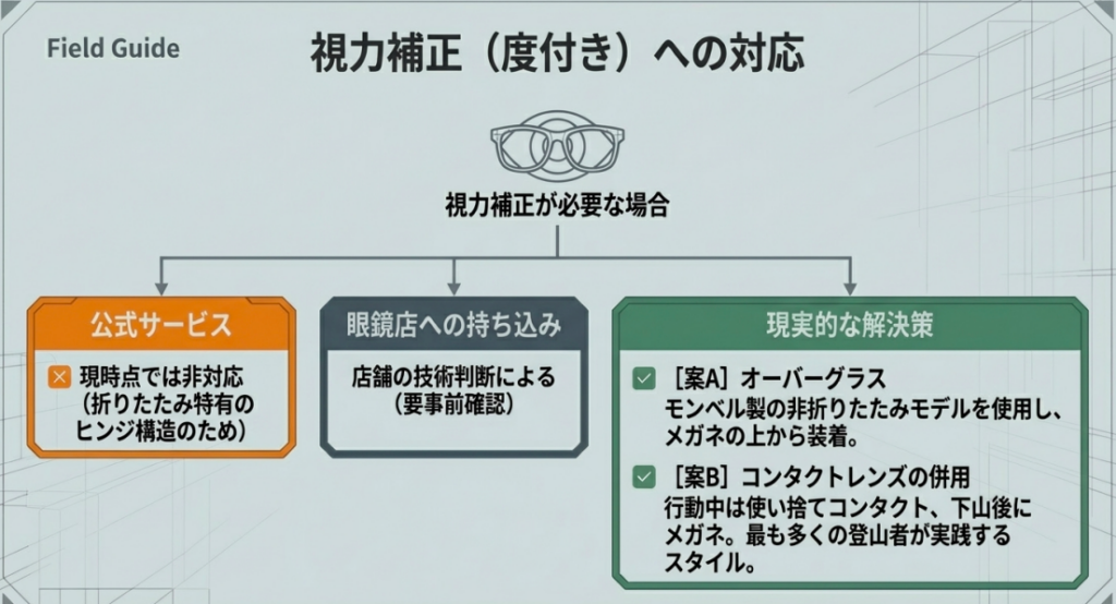 「普段メガネをかけているけど、モンベルの折りたたみサングラスを使いたい」という方からよく聞かれるのが、度付き対応についての疑問です。