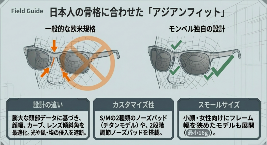モンベルの折りたたみサングラスが日本人ユーザーに支持されている大きな理由のひとつが、アジアンフィット設計です。