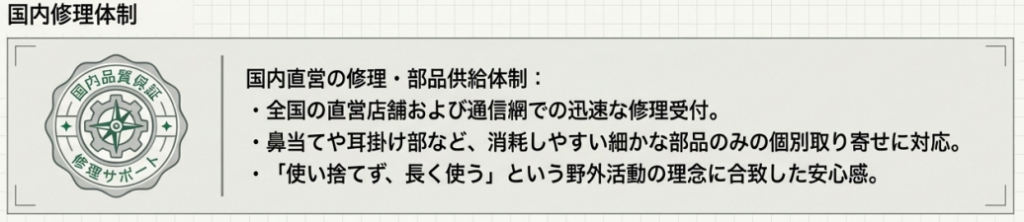 テクニカルギアとしてのサングラスは、適切な手入れと万が一の際の修理体制が揃っていてこそ長く使い続けられます。