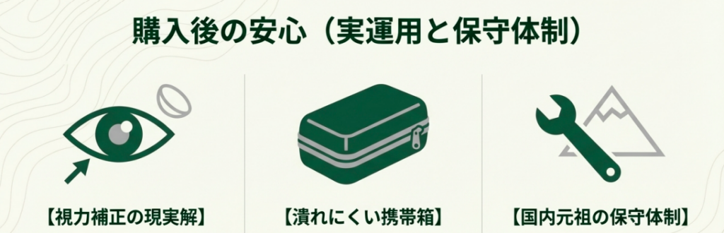 山行中はコンタクト、下山後や宿ではメガネに戻すという使い方が一般的で、視覚の自由度と携行性を両立できる現実的な選択肢かなと思います。