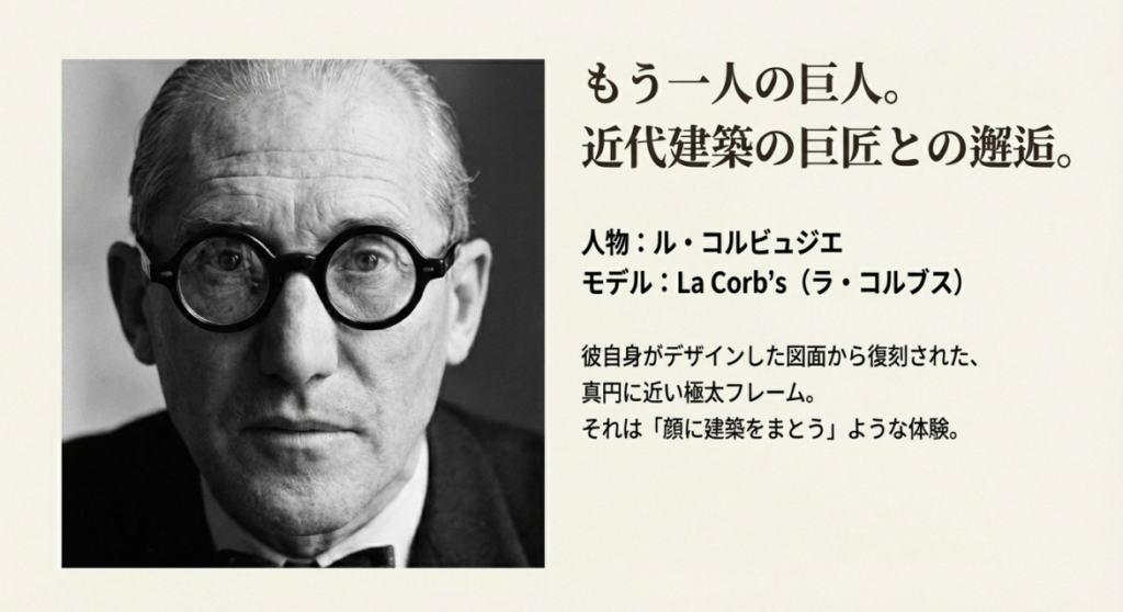 芸能人ではありませんが、レスカを語る上で絶対に避けて通れないのが、近代建築の巨匠ル・コルビュジエです。彼が愛用していた、あの極太の丸メガネ。建築やデザインに関わる人々にとっては、ある種の聖域のような、特別な意味を持つアイコンです。