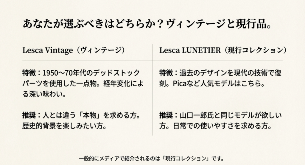 | Lesca LUNETIER (現行コレクション) | 過去のアーカイブやヴィンテージのデザインをベースに、現代の技術と新しい素材で復刻・製造したコレクション。 「Pica」などの人気モデルは主にこちらで展開されています。 | 山口一郎さんと同じモデルが欲しい方、日常使いしやすい耐久性やメンテナンス性を求める方。 |
