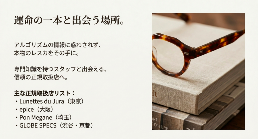 レスカは単に「芸能人が掛けているから」という理由だけでなく、その背景にあるフランス・ジュラ地方の職人技や歴史的背景(ヘリテージ)を纏うことができる特別なアイウェアです。アルゴリズムによる誤情報に惑わされず、ぜひ信頼できるショップで、あなたにとっての「運命の一本」を見つけてくださいね。