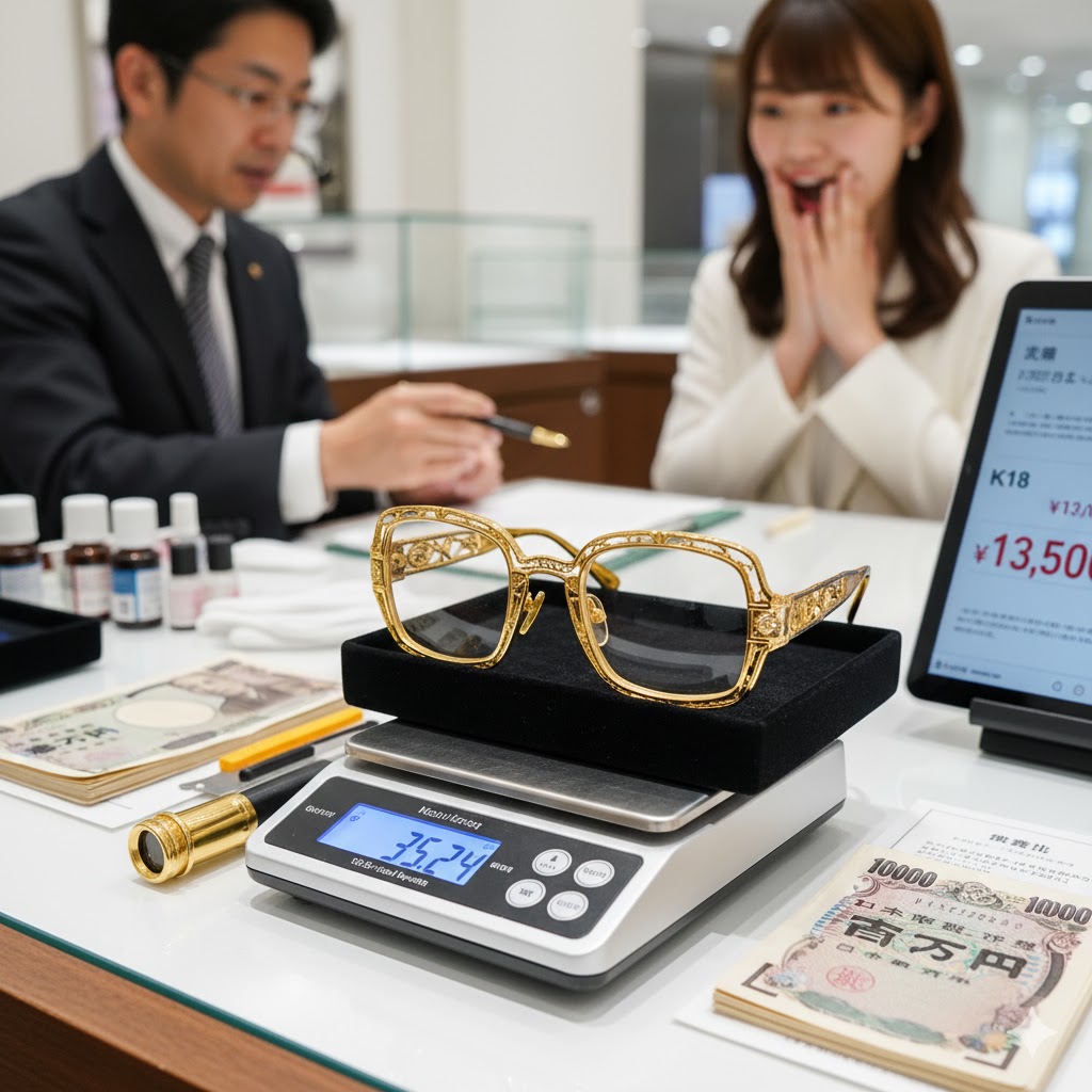 それが、テンプル(つる)やフロントの一部、あるいはフレーム全体に18金(K18)やプラチナといった貴金属が贅沢に使用されている高級品です。もしご自宅で使わなくなった18金メガネフレームが眠っている場合、それは実は貴重な資産かもしれません。