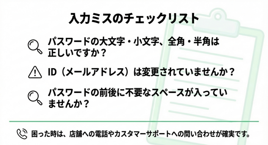 次に多いのが単純な入力ミスです。特にパスワードの大文字・小文字、全角・半角の違いはよくある原因です。