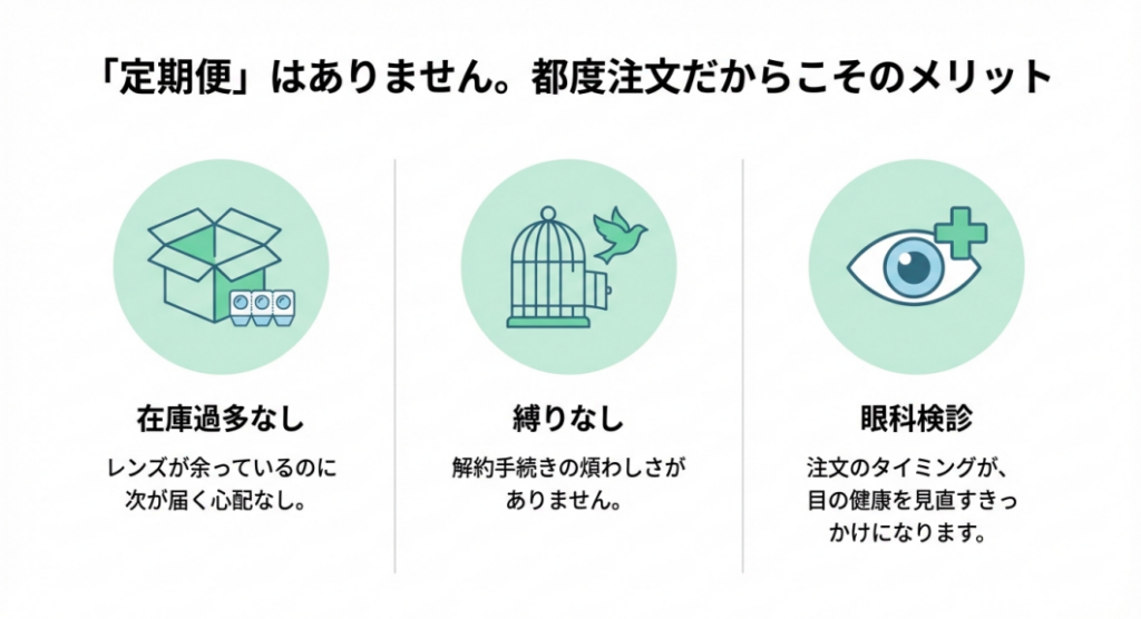 その点、都度注文なら「自分のペース」で管理でき、目の健康を考えるタイミングも生まれやすいです。