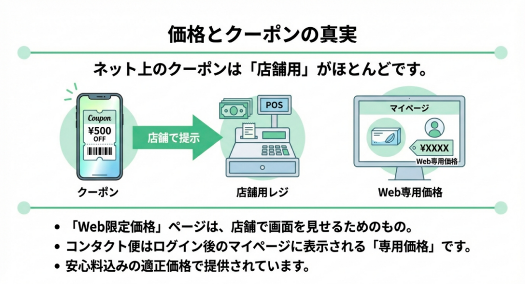 コンタクト便での販売価格は、店頭価格とは異なるとされていますが、そこにさらに店舗用クーポンを適用させることはできません。