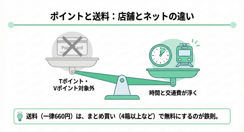 「時は金なり」と考えて、ポイント分は「送料や手間賃が浮いた」と割り切って使うのが賢い選択かなと私は思います。