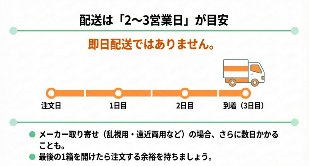 「手持ちがない!明日つけるレンズがない!」と焦ることになるので、最後の1箱を開けたら注文するくらいの余裕を持つことを強くおすすめします。