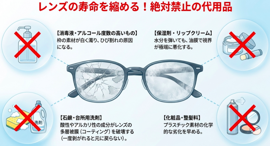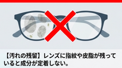 特に、すでに傷がついているレンズや、使用開始から2年以上経過したレンズでは、成分が傷口から入り込んでコーティングの剥離を加速させるリスクがあります。