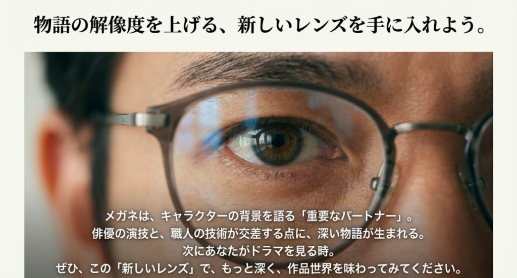物語に深みを与える名バイプレイヤーたちの演技力や、彼らが劇中で着用しているおしゃれなアイウェアについて知ることで、ドラマ鑑賞がもっと楽しくなることは間違いありません。