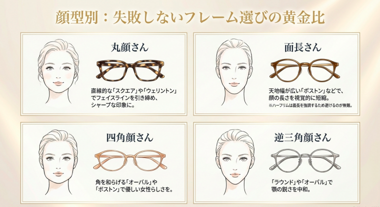 自分に似合う形を知ることは、失敗しないメガネ選びの第一歩です。顔の輪郭を補完するような形を選ぶのが王道バランスですね。