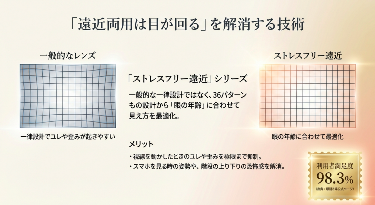 私も気になって調べてみたのですが、眼鏡市場の「ストレスフリーシリーズ」はその不安を技術で解決しようとしています。