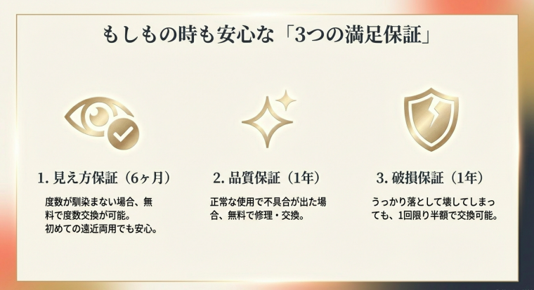 眼鏡市場には、そんな不安をカバーする「3つの満足保証」があります。