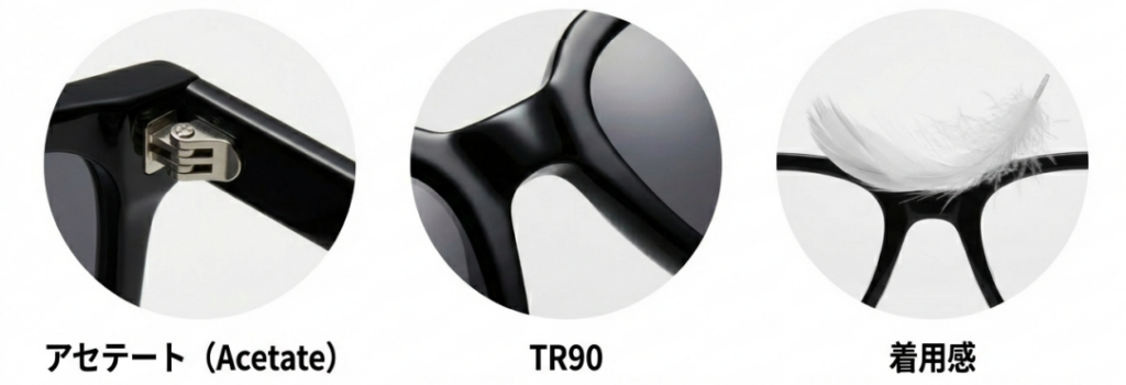 アセテートは高級アイウェアによく使われる素材で、深みのある色合いと肌馴染みの良さが特徴。