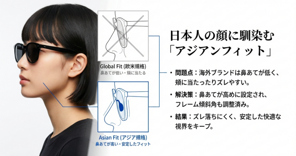 具体的には、鼻あて(ノーズパッド)部分が少し高めに設定されていたり、フレームの傾斜角が調整されていたりするので、鼻からずり落ちにくい安定した装着感を実現しているんです。