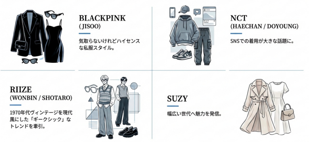 また、NCTのドヨンさんやヘチャンさん、そして最近勢いのあるRIIZEのウォンビンさんやショウタロウさんといった、ファッション感度の高い若手アーティストの着用も目立ちますね。