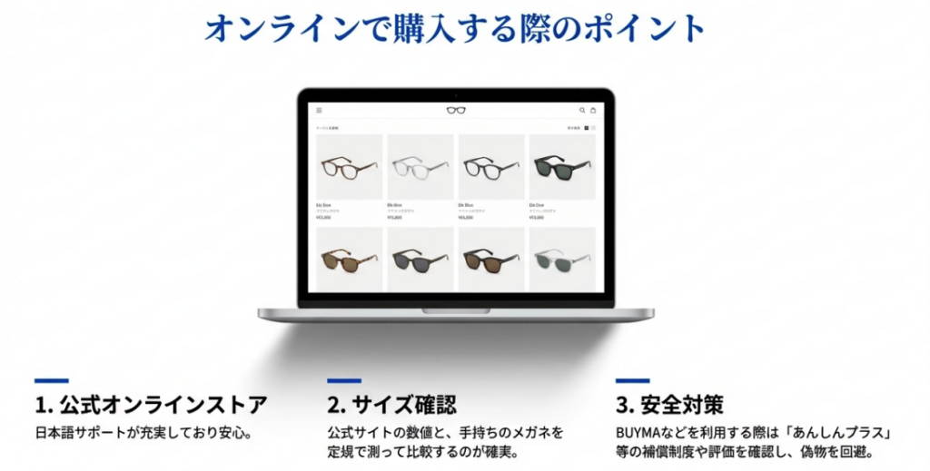 通販で気になるサイズ感については、公式サイトに記載されている数値(フレーム幅やレンズの高さなど)を、手持ちのメガネと比較してみるのが一番確実です。